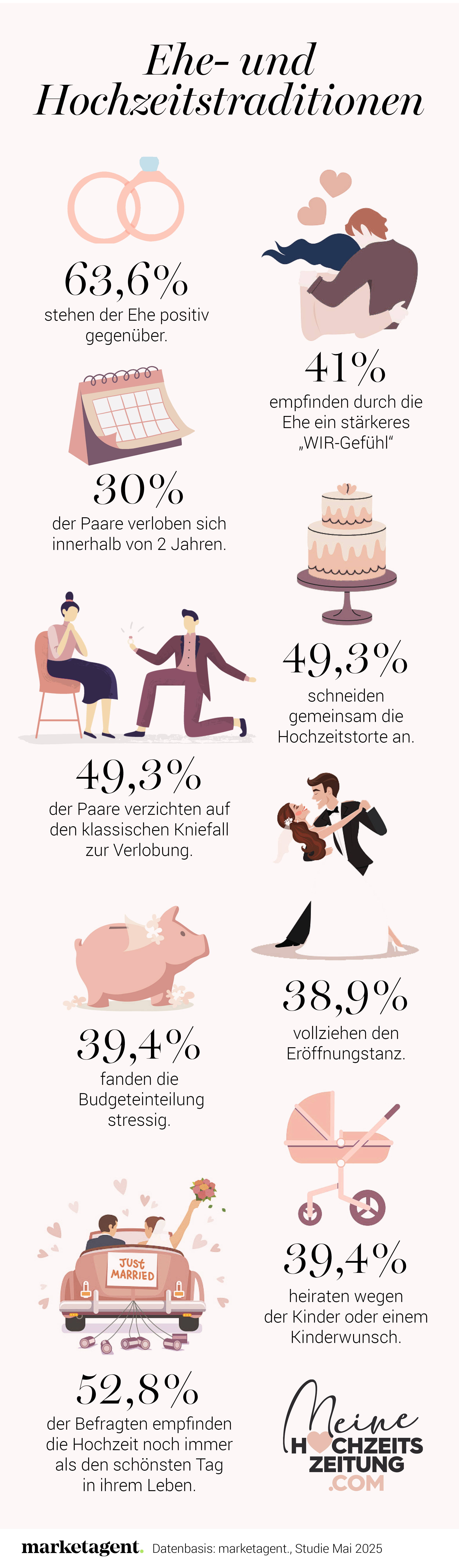 Wie denken Paare heute über die Ehe? Welche Traditionen bleiben, welche verändern sich – und wie emotional ist eine Hochzeit im Jahr 2025 wirklich? Antworten darauf liefert die Hochzeitsstudie 2025, die von MeineHochzeitszeitung.com in Auftrag gegeben und von marketagent. durchgeführt wurde. Die Ergebnisse basieren auf einer Online-Befragung und wurden im Mai 2025 ausgewertet. Sie geben spannende Einblicke in moderne Hochzeitsvorstellungen, Planungsrealitäten und persönliche Prioritäten.