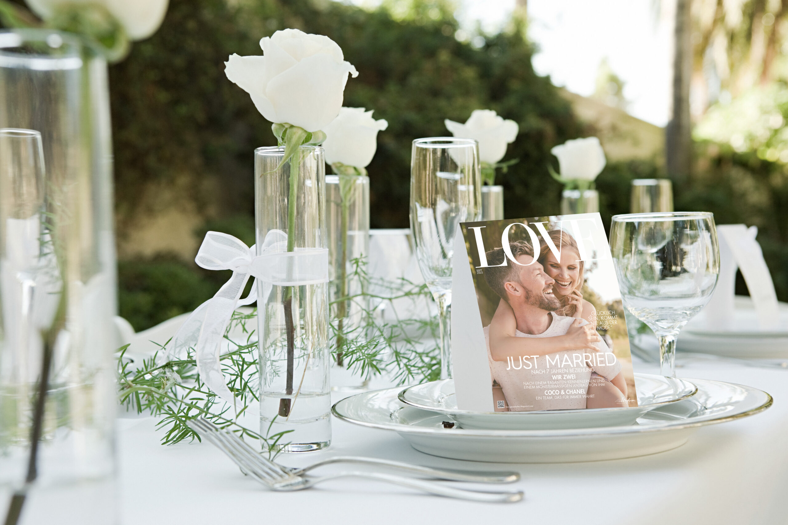 Anstelle der traditionellen Tischkarten können individuelle Magazin-Cover erstellt und auf den Tischen platziert werden. Jedes Cover zeigt den Namen und ein Foto des entsprechenden Gastes. Diese persönliche Note macht es den Gästen leicht, ihren Platz zu finden und schafft gleichzeitig eine unterhaltsame und einzigartige Atmosphäre.